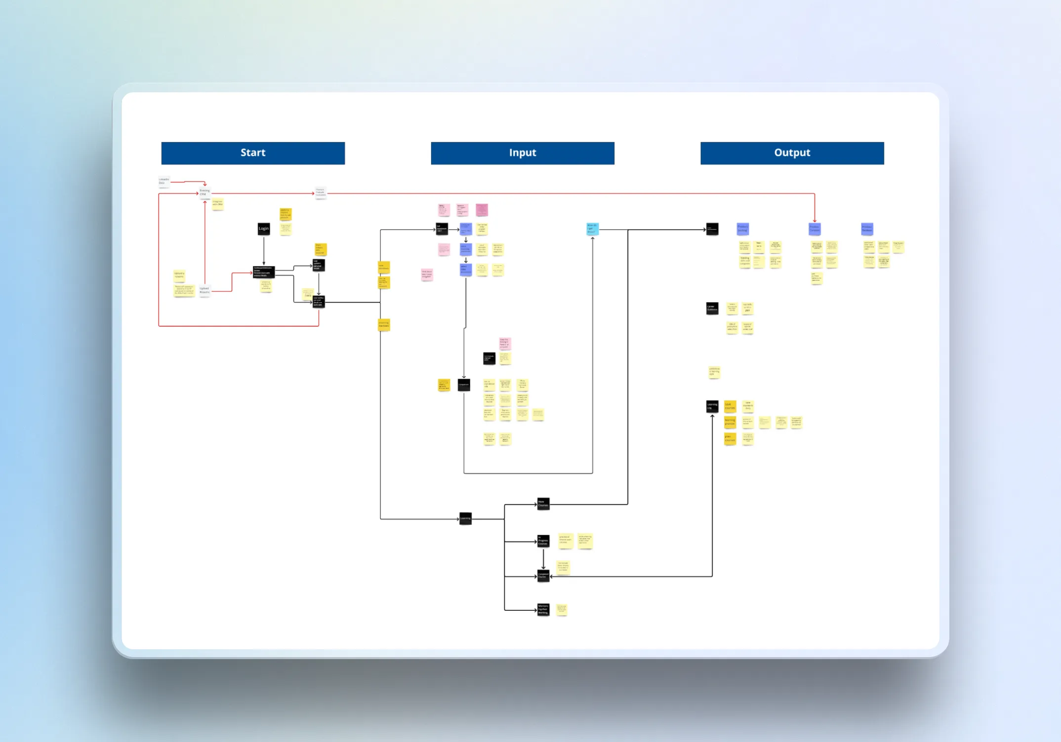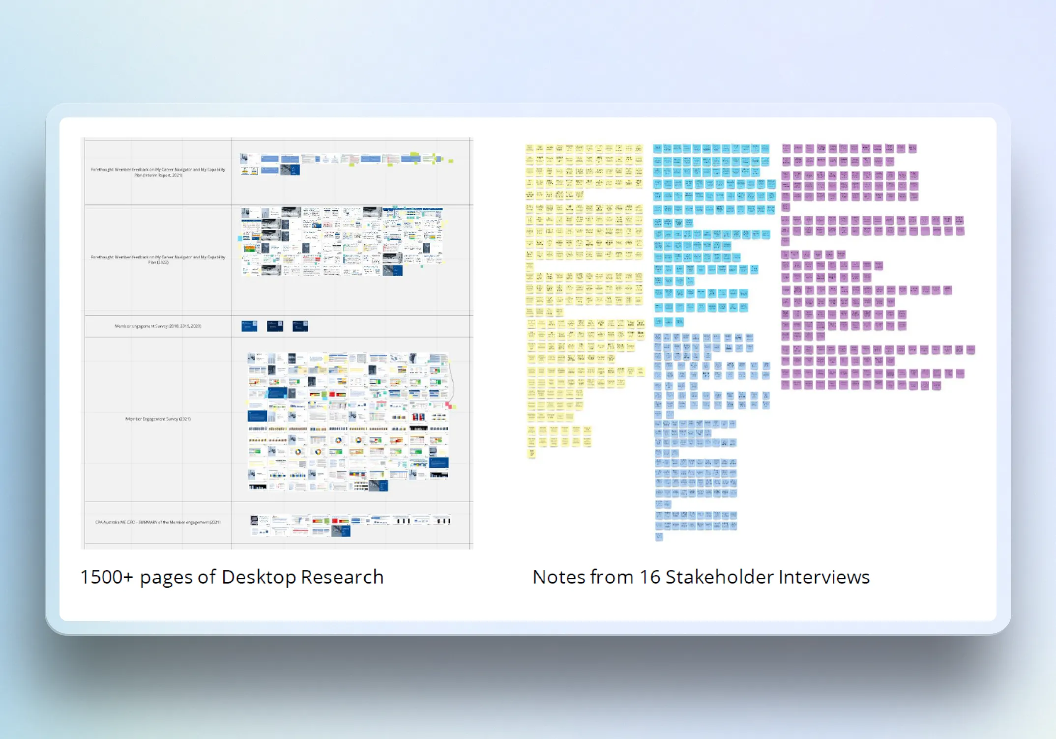 We started by understanding the existing experience across the two career development tools and identifying where members were struggling. The team reviewed 1,500+ pages of existing research and interviewed 16 stakeholders to build a clearer picture of member needs, business priorities, and gaps in the current experience.